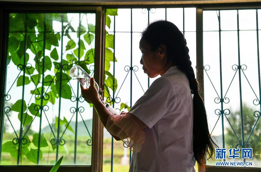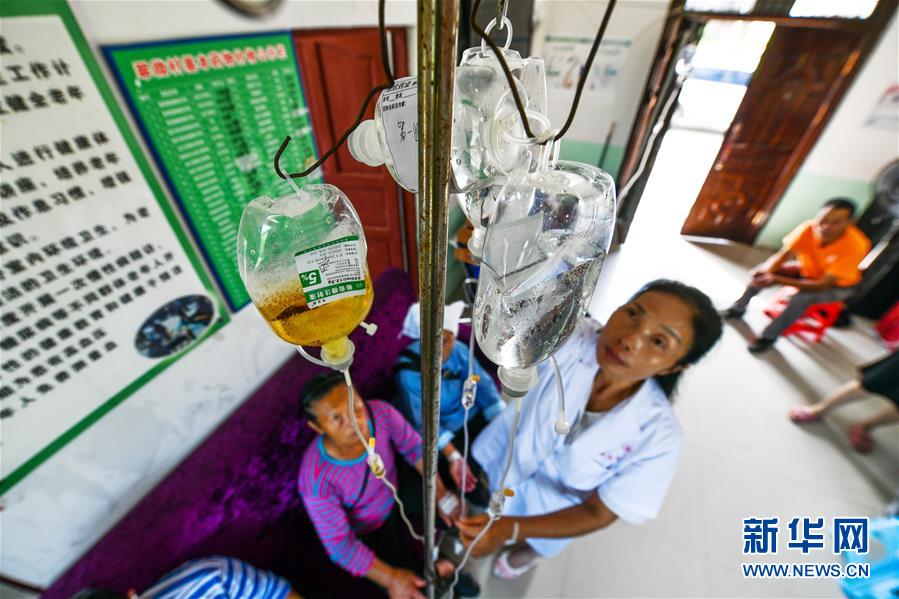 罗木在翠微村卫生室为村民配药输液。新华社记者 杨文斌 摄