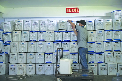 黄曙光在仓库里忙着整理回收来的饮水机。