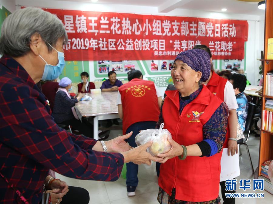 王兰花(右)向来到兰花志愿服务站参加活动的老人发放“爱心水果”。新华社记者 贾浩成 摄