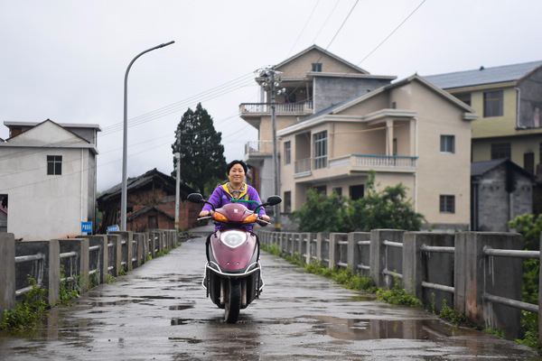 杨文清骑着摩托车行驶在登云寨村。新华社记者薛宇舸 摄