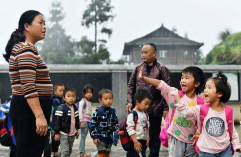 9月8日,贵州省榕江县忠诚镇苗本小学的夫妻教师潘明珍、滚录权夫妇组织学生排队放学。新华社记者 杨文斌 摄
