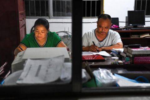9月8日晚上,贵州省榕江县忠诚镇苗本小学的夫妻教师滚录权、潘明珍在学校备课。新华社记者 杨文斌 摄