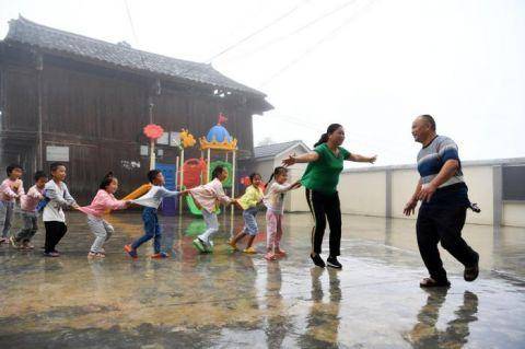 9月9日,贵州省榕江县忠诚镇苗本小学的夫妻教师滚录权、潘明珍与学生做游戏。新华社记者 杨文斌 摄