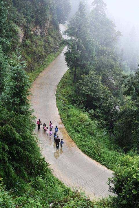 9月8日,贵州省榕江县忠诚镇苗本小学的夫妻教师滚录权、潘明珍护送路远的学生回家。新华社记者 杨文斌 摄