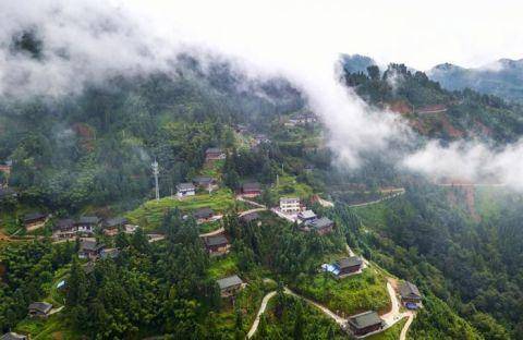 这是9月9日拍摄的大山深处的贵州省榕江县忠诚镇苗本村,图中三层白色楼房为苗本小学教学楼(无人机照片)。