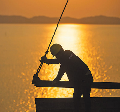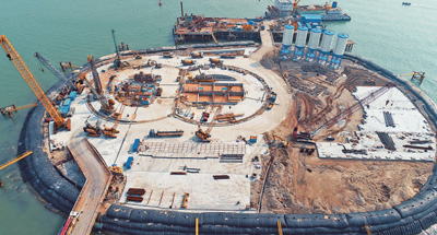 | 2月24日,粤港澳大湾区深中通道建设工地上,施工人员在伶仃洋大桥西锚碇地连墙开槽施工。 贺林平 杨前明摄影报道 |