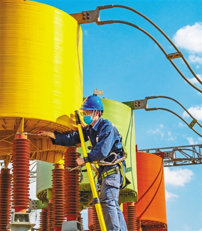 | 2月24日,乌东德电站送电广东广西特高压多端直流示范工程各个作业点已全面复工,工人正在对500千伏龙海变电站3号电容器组支柱上的螺栓进行检查固定。 叶传增 赵洋洋摄影报道 |