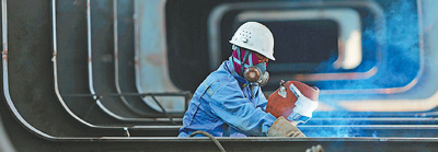 | 2月20日,江西赣州南河大桥拓宽改造施工现场,工人在电焊作业。 陈地长摄(影像中国) |