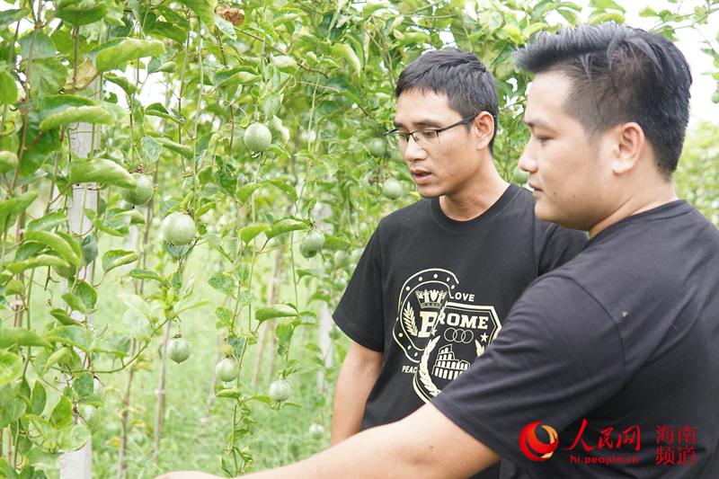 韦龙青(左)和给合作伙伴讲解如何打理果园(人民网海南频道 樊欢迪摄)