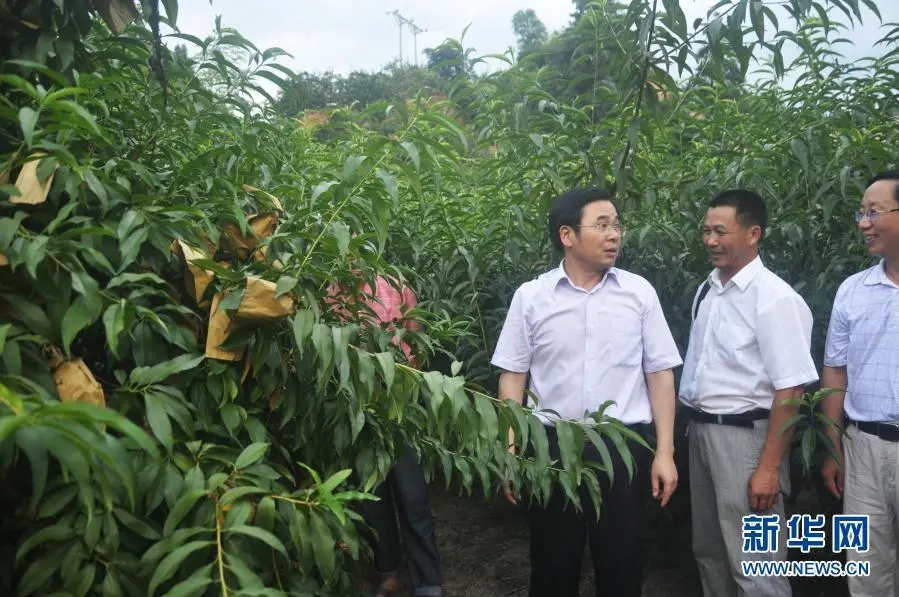 2011年7月,黄诗燕(右三)在霞阳镇考察黄桃种植业。新华社发