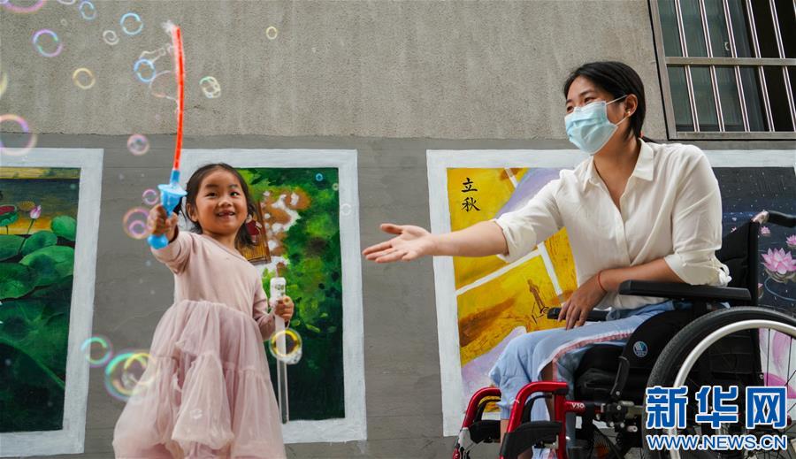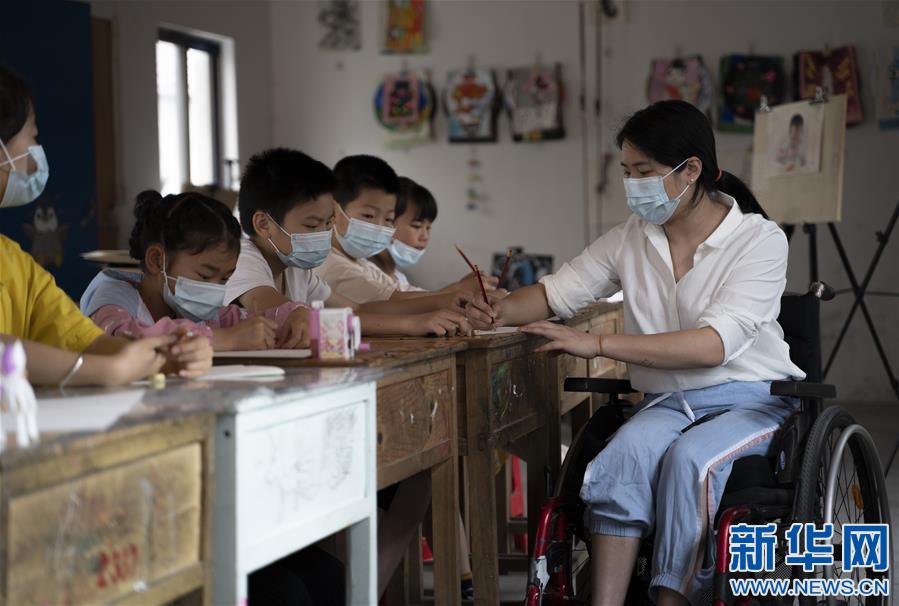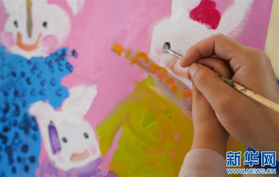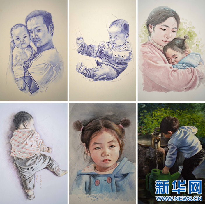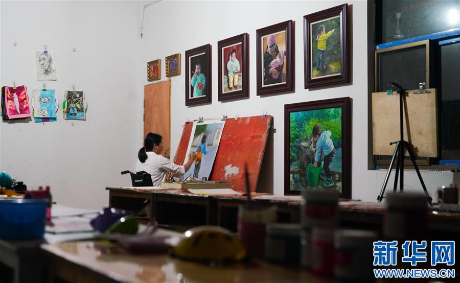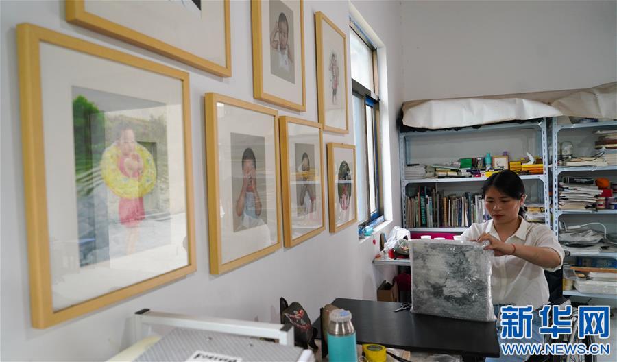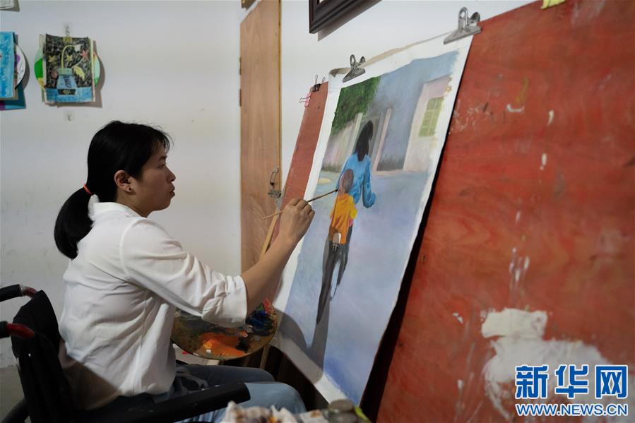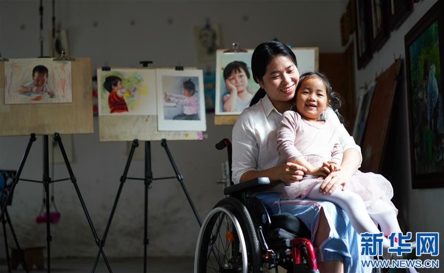 从女儿出生之日至今,每隔一段时间,张海晶就会为女儿画上一幅画,记录下她成长过程中的点点滴滴。张海晶学画画是“半路出家”的。今年30岁的张海晶从小在浙江丽水长大,2008年,她在阳台收衣服时不幸从六楼跌落,虽然生命得以挽救,她却从此失去了行走的能力,只能与轮椅为伴。 突如其来的打击让张海晶情绪低沉了一年多。2009年,一次偶然的机会,张海晶接触到绘画并为之着迷。她每天都坐着轮椅去学画画,也认识了许多志同道合的朋友。在他们的鼓励下,张海晶逐渐从痛苦中走了出来。 “那时候我真的迷上了画画,有些无法用言语述说的伤痛,却可以在安静的绘画过程中得以平复。”张海晶说。 2014年,张海晶在浙江绍兴认识了但誉超。但誉超也是一名残疾人,从小没有了右手。或许是有着相似的经历,两人有着很多共同语言,很快便坠入爱河。次年,张海晶跟随但誉超回到了位于江西省都昌县大港镇的老家,成为一名“外来媳妇”。 由于夫妇二人身体残疾加上家中老人身体孱弱,2016年,夫妇二人被当地识别为建档立卡贫困户。为了改善生活,张海晶利用绘画特长,出售自己的作品以增加家庭收入。在当地政府的帮扶下,张海晶在镇上创办了美术工作室,在指导当地的留守儿童学习绘画的同时,创作绘画作品在网上销售。丈夫但誉超在政府帮扶下也有了自己的工作。2018年,张海晶一家脱贫摘帽。 “我希望利用我的专长,普及农村美术教育,让更多的农村孩子学到一些绘画知识,为他们打开一扇绘画世界的大门,让他们的生活多一种可能。”张海晶说。 新华社记者 胡晨欢 摄
