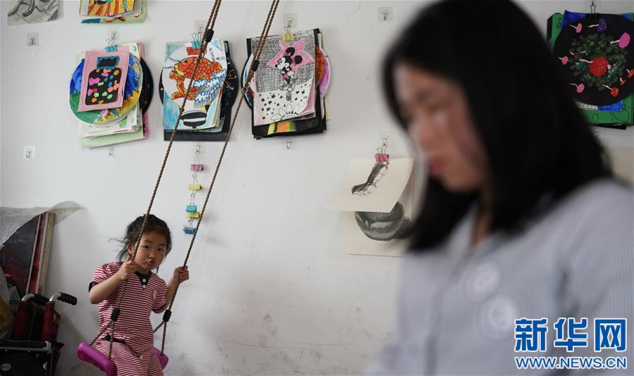 女儿在张海晶的工作室内荡秋千。新华社记者 胡晨欢 摄