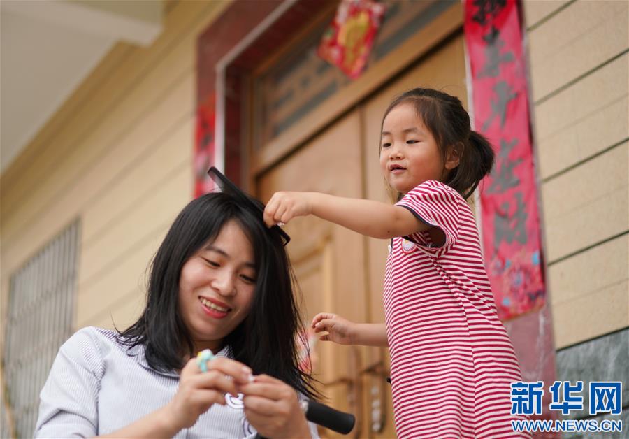 在家门前,女儿但砚文给张海晶梳头(5月8日摄)。新华社记者 胡晨欢 摄