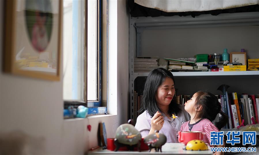 张海晶在工作室内喂女儿吃水果(5月8日摄)。 新华社记者 胡晨欢 摄