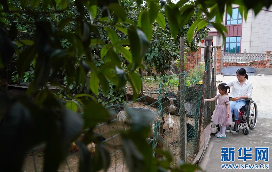 张海晶和女儿在院子里喂鸡(5月7日摄)。新华社记者 胡晨欢 摄