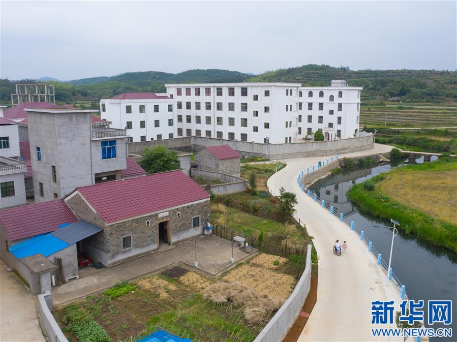 张海晶和女儿走在乡镇的小路上(5月7日摄,无人机照片)。新华社记者 胡晨欢 摄