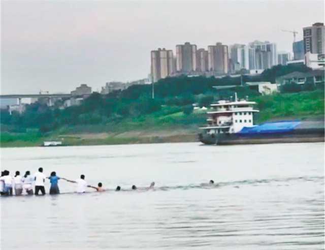 湍急的江面上,十几名市民组成一道“人链”,手挽着手、呼喊着,延伸至滚滚江心,将一个溺水的孩子托举传递。而远在江心一个只露出头的模糊影子,载浮载沉逐渐消失于江水中……