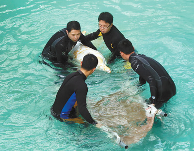 “当受伤的白海豚在救护中心接受治疗时,队员要经常下水,给它身体上药,做B超和血常规检查。”高广银说,救治白海豚的日常工作很辛苦,“海豚吃得多,排泄也多,味道也很大。在治疗池中,每一次翻动它的身体,喂食海鱼或者补充营养液,都需要好几名队员协作,还要配合吊机使用,确实是个体力活。”