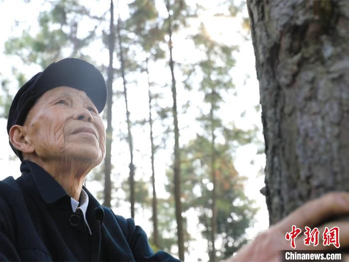 中新网永州12月17日电 (张祖智 廖湘)一把锄头、一双布鞋,爬过屋后山坡,来到山丘上的松树林,99岁的杨贵财用布满老茧的大手抚摸树干,巡视树林。