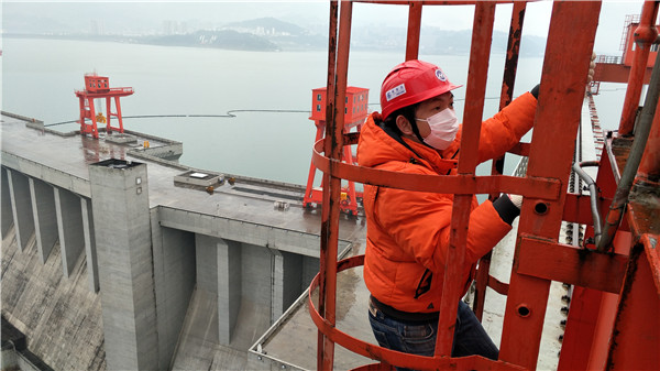 李然正在对升船机设备进行检修。图片来源:宜昌文明网