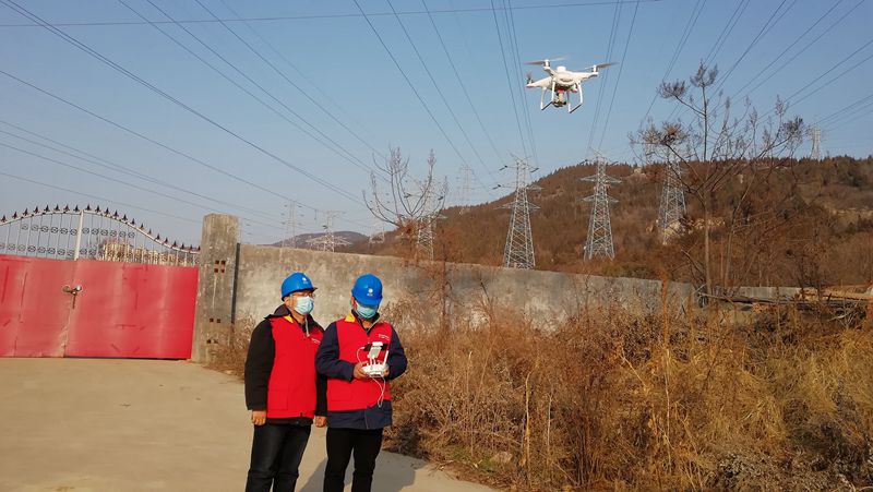 张涛(左)和同事使用无人机对因封路不能达到的线路开展巡视。图片来源:淮北文明网