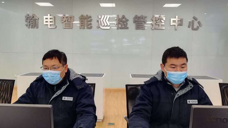 张涛(左)通过远程视频关注输电线路运行情况。图片来源:淮北文明网