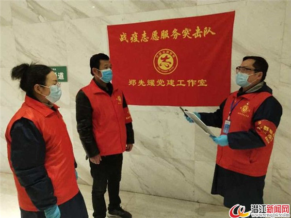 郑先耀(中)在留观点跟志愿者一道商量服务工作。图片来源:潜江新闻网