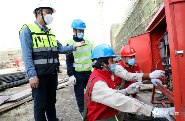 在江苏省灌云县小伊乡花果山新建机场施工场地,伴随着震耳欲聋的挖机声、搅拌机的轰鸣声,各类大型施工器械在现场开动起来。在机场建设现场,来自供电公司的开山岛党员服务队正在对复工复产的花果山机场建设用电开展常规的安全巡检,积极为机场项目建设提供良好服务和外部环境,力求为省市重大项目供好电、服好务。同时,公司党员服务队充分发挥共产党员突击队的先锋作用,及时做好跟踪服务、参与驻点宣传、积极服务大项目建设工程安全用电,从而当好大项目建设的“先行官”。
