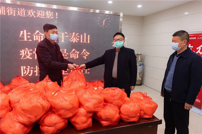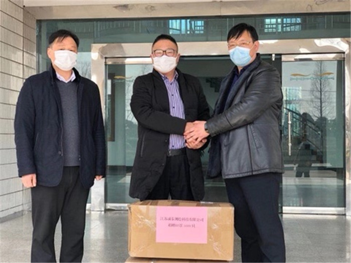 侯先栋(中)捐赠防护物资。图片来源:泰州文明网