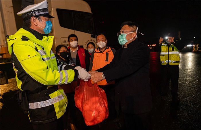 侯先栋(右二)为高港区卡口执勤工作人员送包子。图片来源:泰州文明网