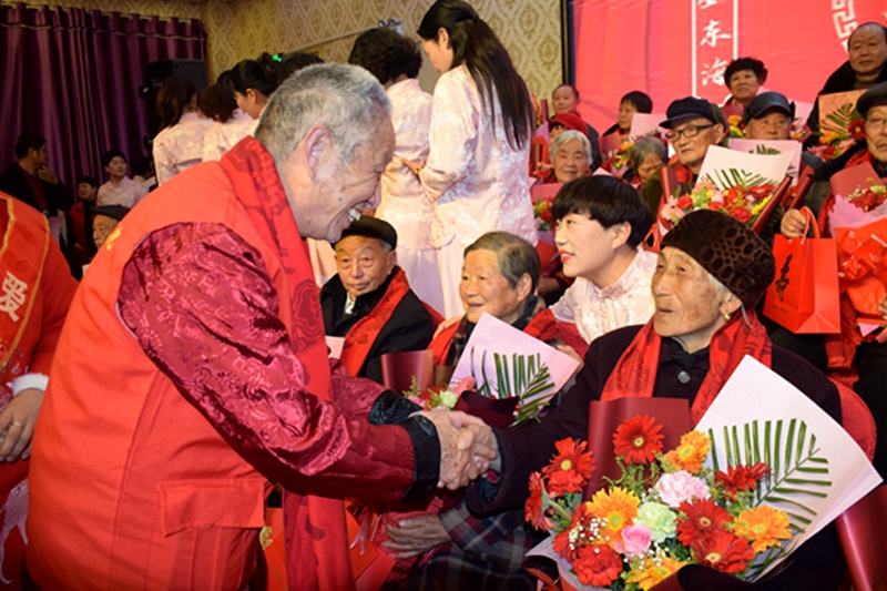腊八节集体庆寿活动,何兴让(左一)为老人送去祝福。陆建军 摄