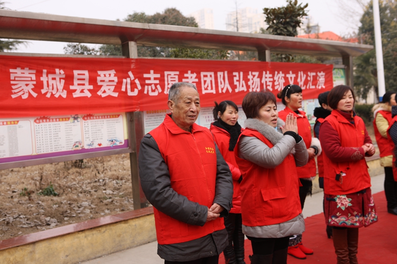 何兴让(左一)走进社区参与爱心演出。图片来源:蒙城县文明办