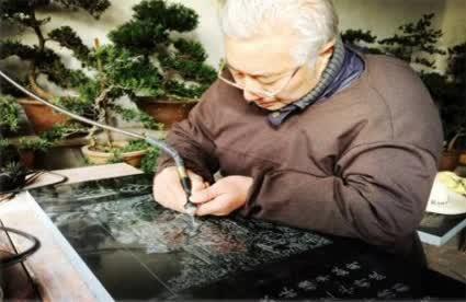 是的,这是一双被雕刻刀磨得全是老茧的手。168块碑石上的图文是袁金华一刀一凿雕刻出来的。建悟园的过程中,袁金华便自学起雕刻,不单是为了节约成本,更是为了充分表达雕刻主题的内涵。在大理石上雕刻字画,可谓是“细活儿”,最小的字不足一厘米,一般的字也只有常规的三号字大小,而且人物像的线条弯弯曲曲,很难把握。蒙古黑的大理石特别坚硬,光雕刻用的吊磨机,袁金华前后就换了三台,磨头用去一千多只,雕刻刀坏了十余把。他手上的血泡起了又消,消了又起。雕刻时,为了手指的灵活,又不能戴手套,而雕刻的粉尘四处飞扬,又必须戴上口罩和眼罩。夏天,酷暑炎炎,但又不得不套上外套遮挡粉尘;冬天,寒风凛冽,手冻得发红。