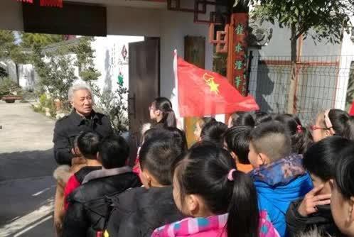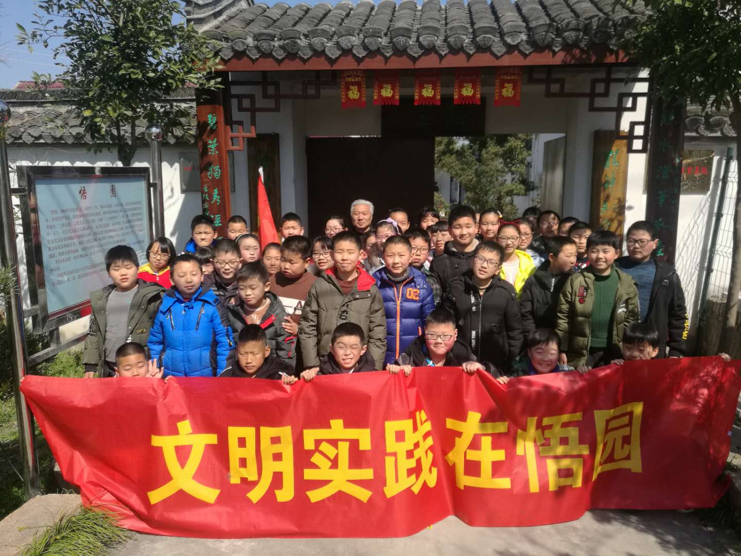 袁金华(后排中)在悟园接待参加文明实践的学生。资料图片