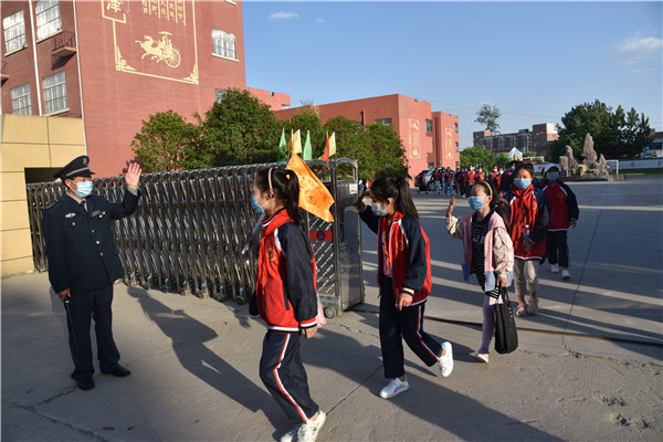 朱士领(左一)坚守护学岗。图片来源:宿迁文明办