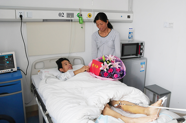 躺在病床上的朱士领。图片来源:宿迁文明办