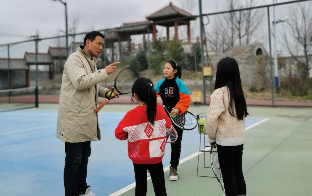 李树林(左一)向孩子们讲授如何使用网球拍。图片来源:亳州文明网