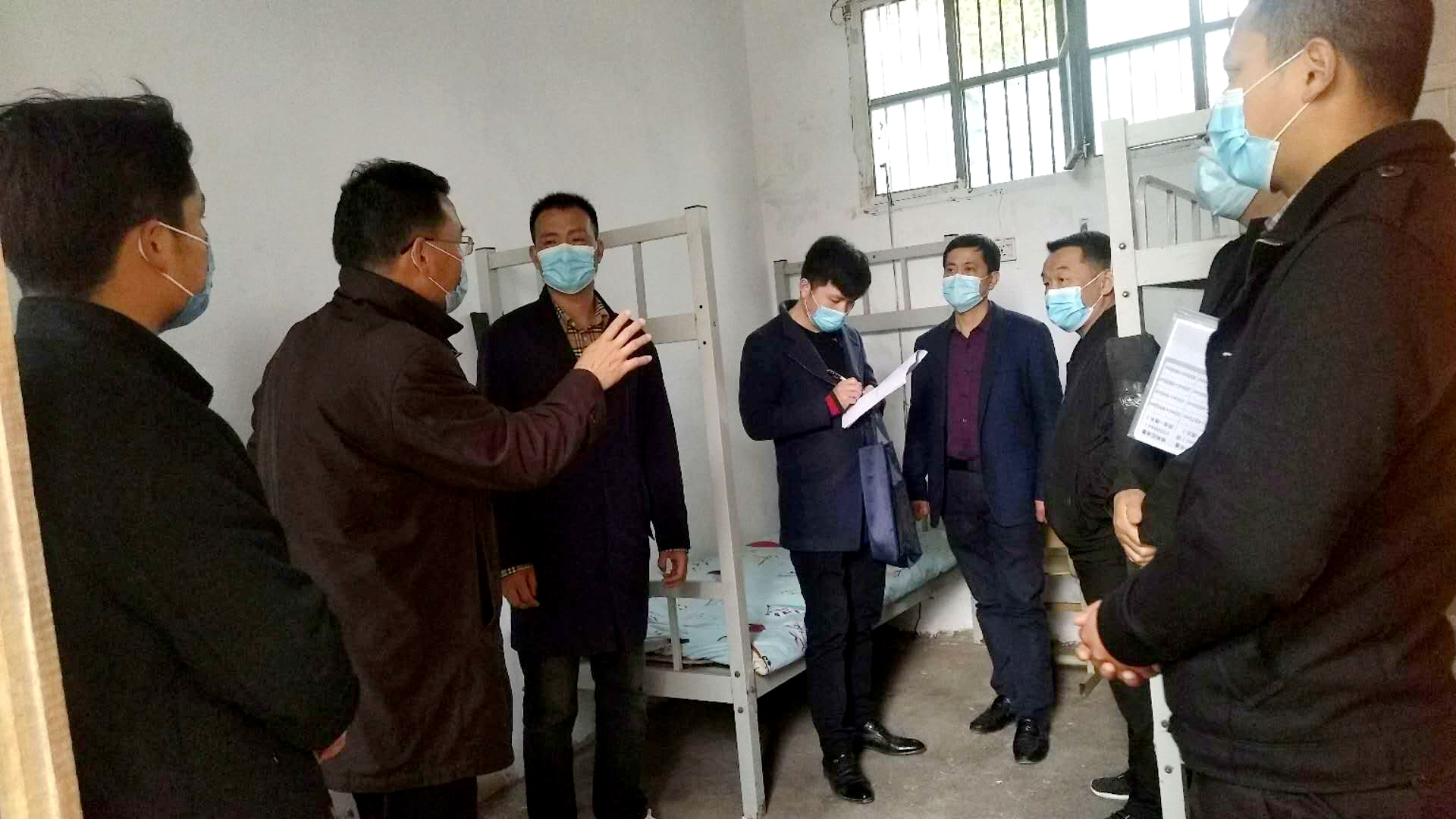 李树林(左三)与工作人员检查宿舍疫情防控情况 图片来源:亳州文明网