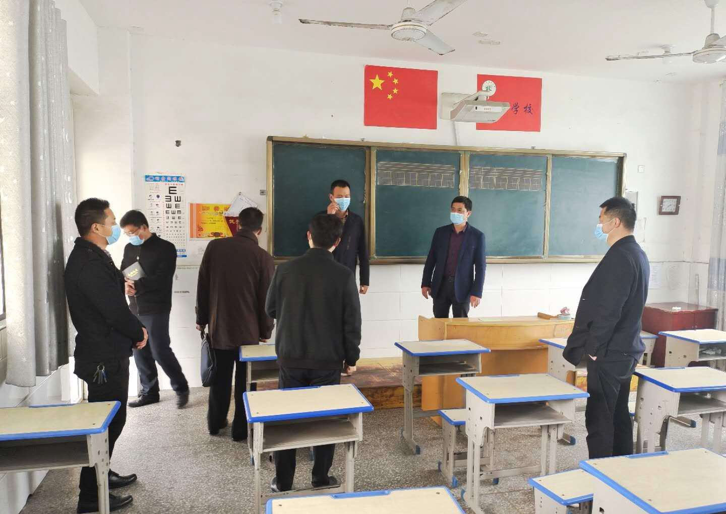 李树林(中)与工作人员检查教室疫情防控情况 图片来源:亳州文明网