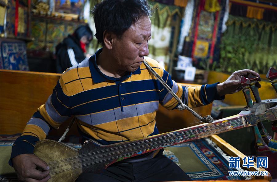 “牛头旅馆”老板多吉在旅馆里给游客弹六弦琴(5月17日摄)。新华社记者 普布扎西 摄