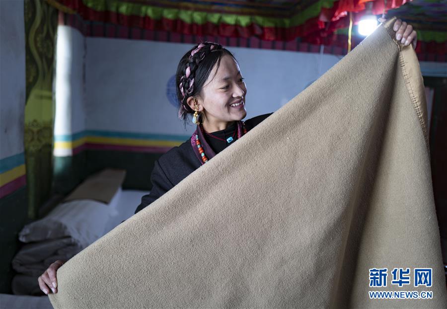 “牛头旅馆”老板多吉的儿媳在旅馆里整理被褥(5月17日摄)。新华社记者 普布扎西 摄
