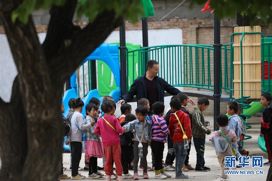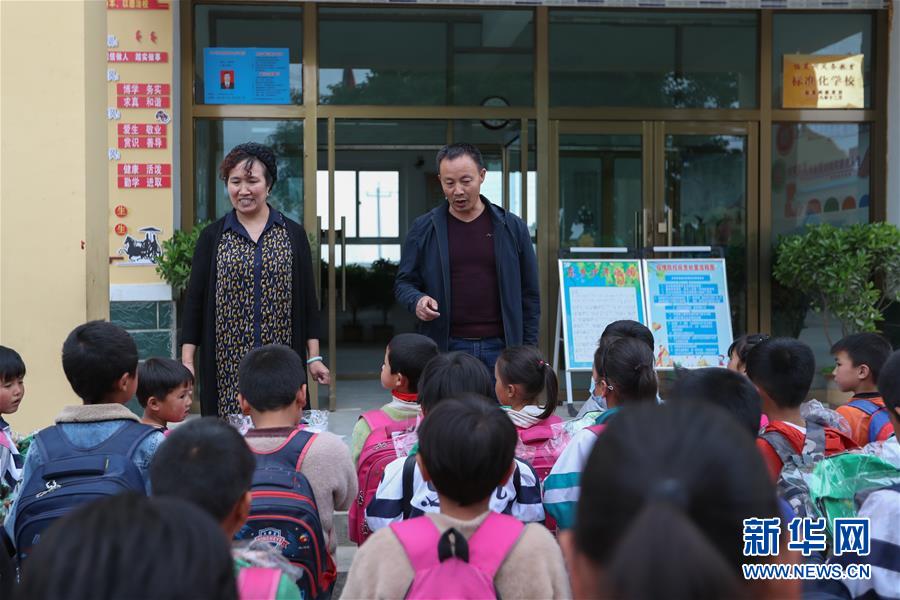 6月1日,在乔鲁小学,马翠花(后左)和唐金海(后右)在放学时给学生交代事项。