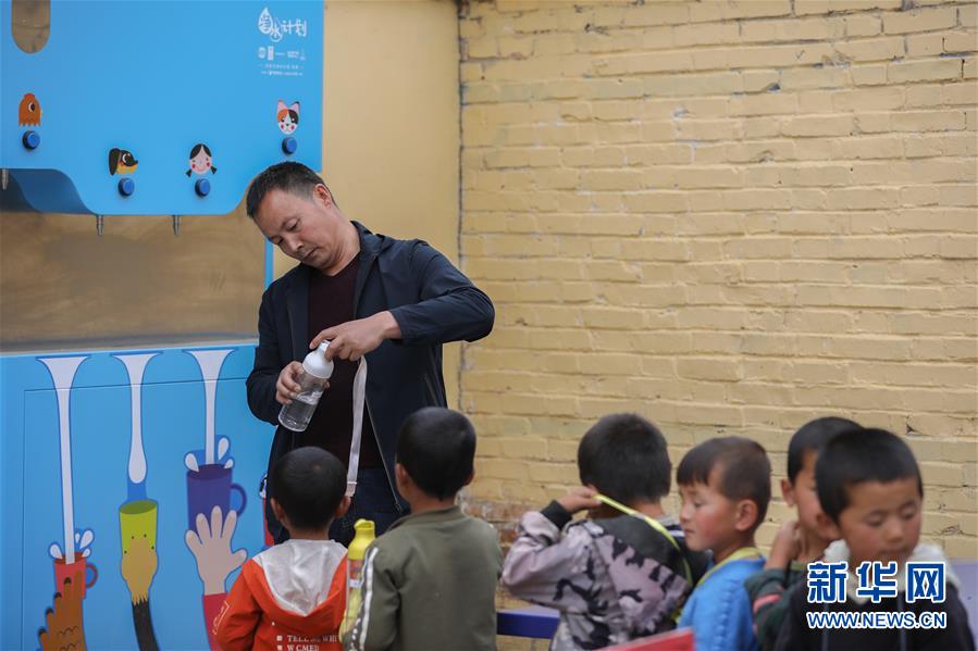 6月1日,在乔鲁小学,唐金海帮助学生打水。净水计划进入乔鲁小学后,这里的孩子们都可以喝上干净的饮用水。