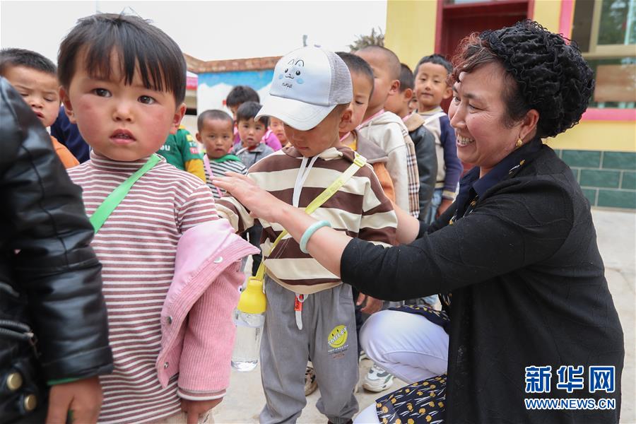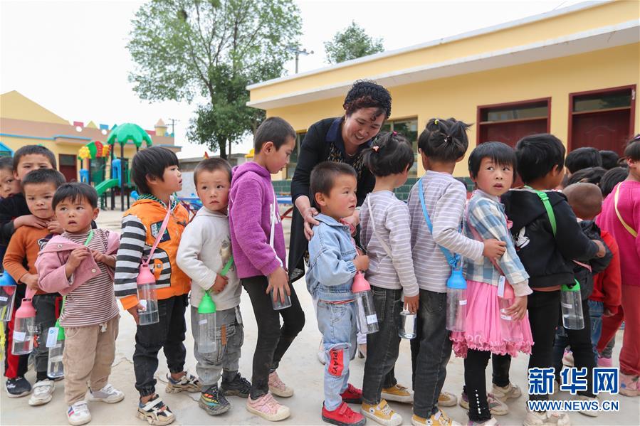6月1日,在乔鲁小学,马翠花帮学生背好水壶。