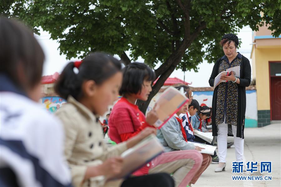 6月1日,在乔鲁小学院子里,学生们在上读书课,马翠花指导学生阅读。