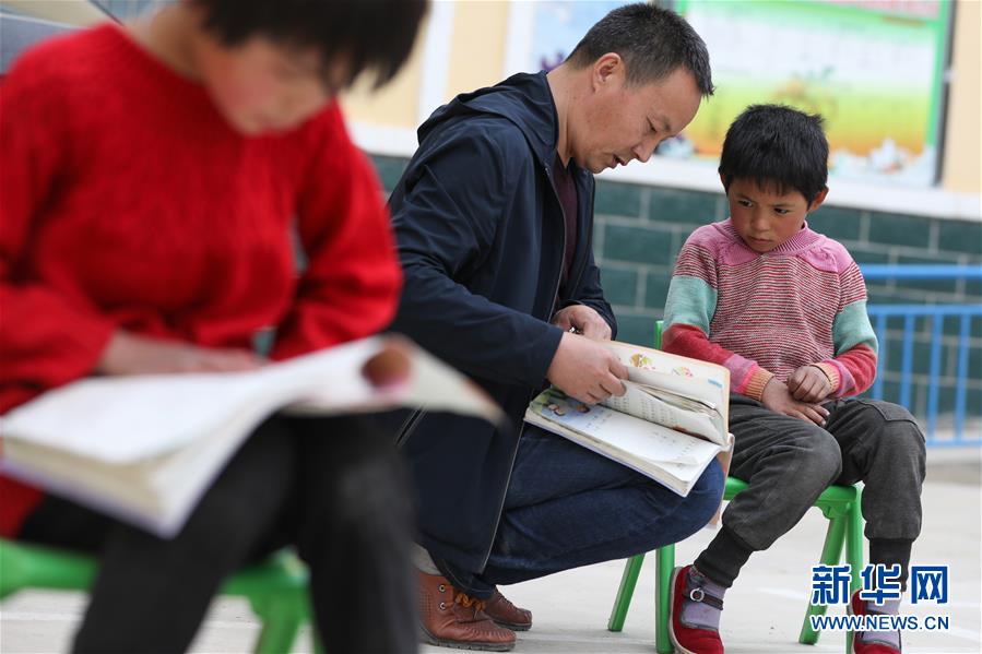 6月1日,在乔鲁小学院子里,学生们在上读书课,唐金海(中)指导学生阅读。
