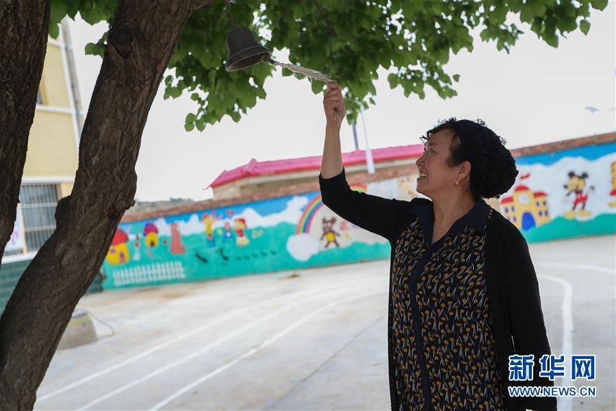 6月1日,在乔鲁小学,马翠花打响下课铃。这个传统的铃铛在乔鲁小学已用多年,至今仍在使用。