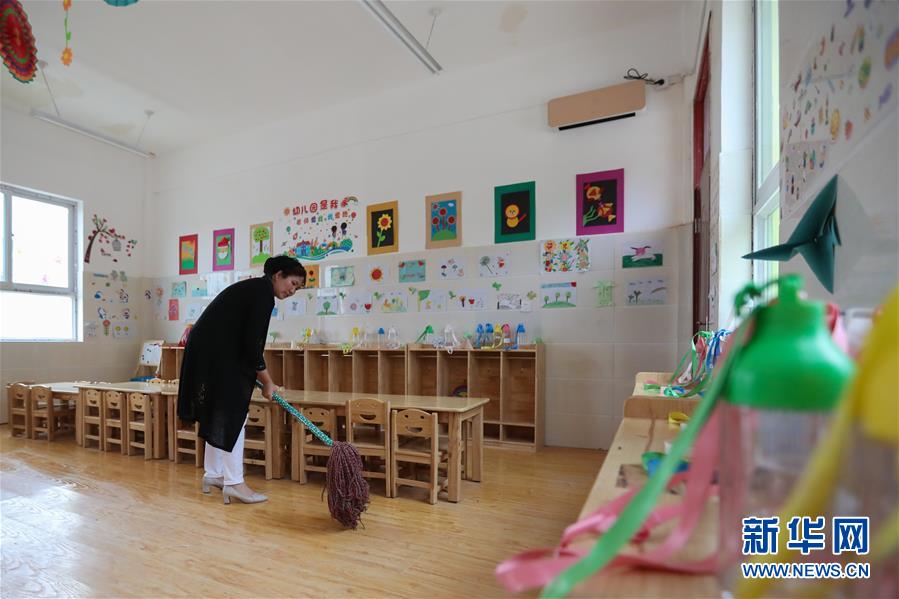 6月1日,在乔鲁小学学前教育班级,马翠花在课后打扫教室卫生。