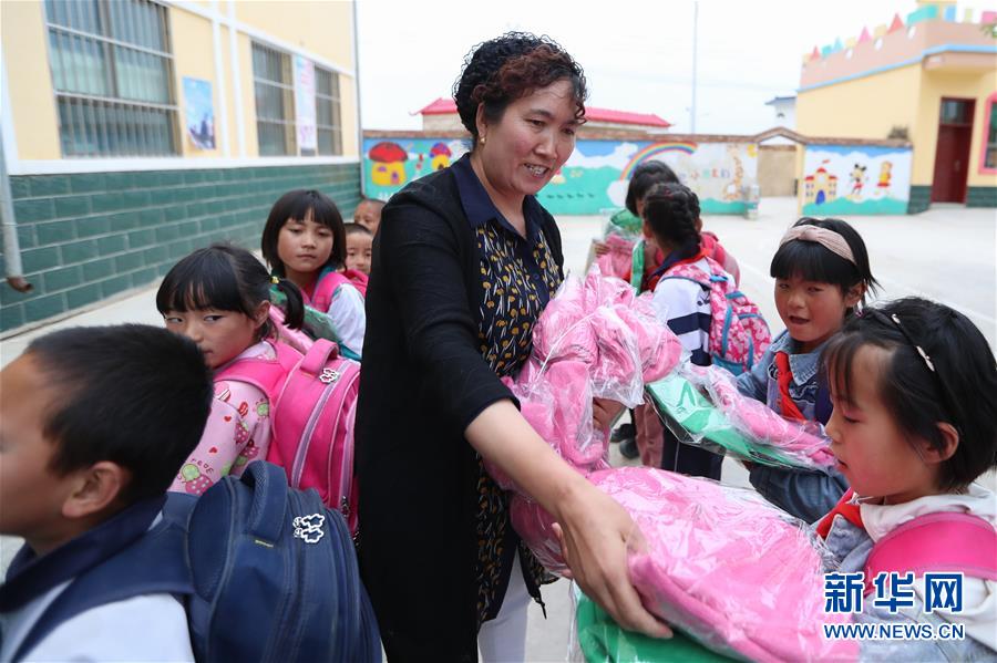6月1日是国际儿童节,在乔鲁小学,马翠花给学生们发放企业资助的书包、毛衣等物品。