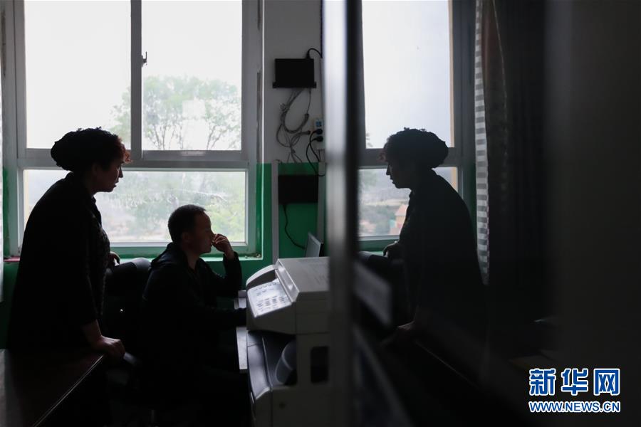 6月1日,在乔鲁小学,马翠花(左一)和唐金海(左二)在放学后整理教学资料。